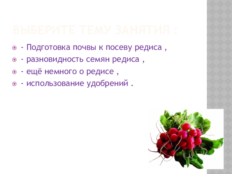 ВЫБЕРИТЕ ТЕМУ ЗАНЯТИЯ :- Подготовка почвы к посеву редиса ,- разновидность семян редиса , - ещё немного