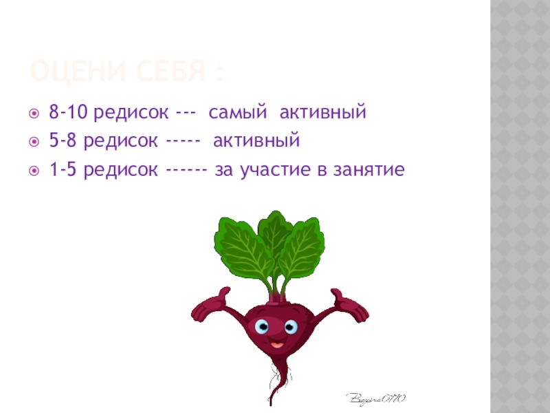 ОЦЕНИ СЕБЯ :8-10 редисок --- самый активный 5-8 редисок ----- активный 1-5 редисок ------ за участие в