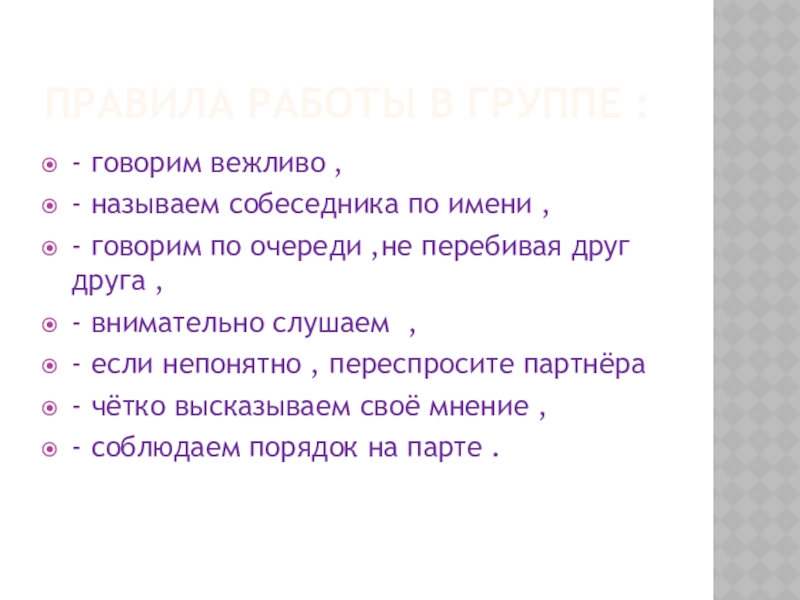 ПРАВИЛА РАБОТЫ В ГРУППЕ :- говорим вежливо ,- называем собеседника по имени ,- говорим по очереди ,не