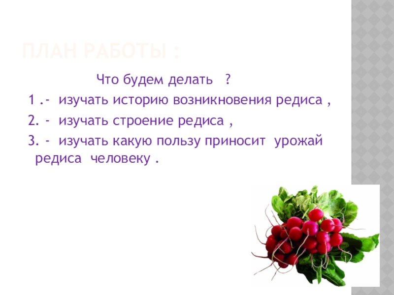 3. - изучать какую пользу приносит урожай редиса человеку .