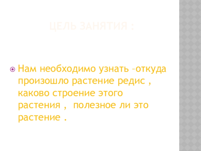 ЦЕЛЬ ЗАНЯТИЯ :Нам необходимо узнать –откуда произошло растение редис , каково