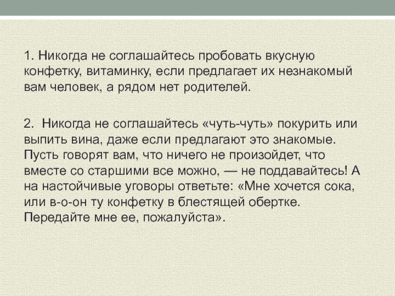 1. Никогда не соглашайтесь пробовать вкусную конфетку, вита­минку, если предлагает их незнакомый вам человек, а рядом нет родителей.2. Никогда не соглашайтесь «чуть-чуть» покурить или выпить вина, даже если предлагают это знакомые. Пусть говорят вам, что ничего