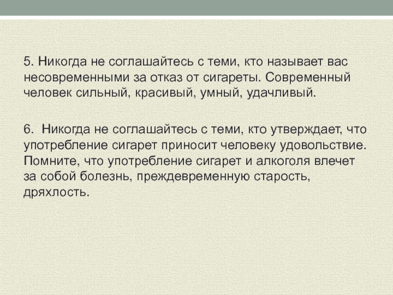 5. Никогда не соглашайтесь с теми, кто называет вас несовремен­ными за отказ от сигареты. Современный человек сильный,