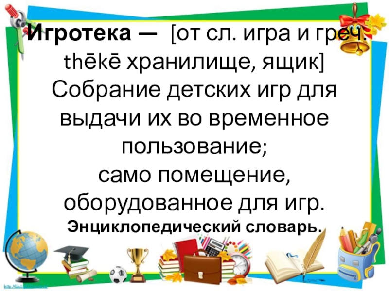 Слайд 13 Игротека — [от сл. игра и греч. thēkē хранилище, ящик] Собрание