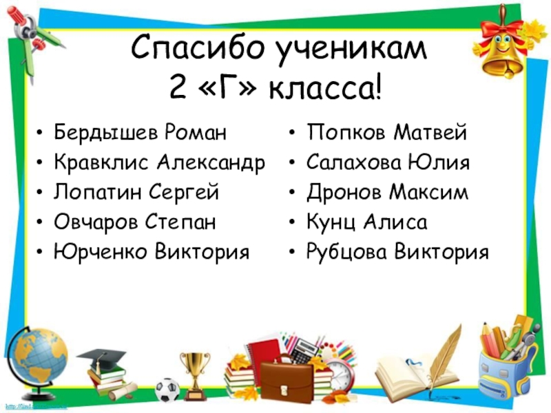 Спасибо ученикам  2 «Г» класса!Бердышев РоманКравклис АлександрЛопатин СергейОвчаров СтепанЮрченко ВикторияПопков МатвейСалахова ЮлияДронов МаксимКунц АлисаРубцова Виктория