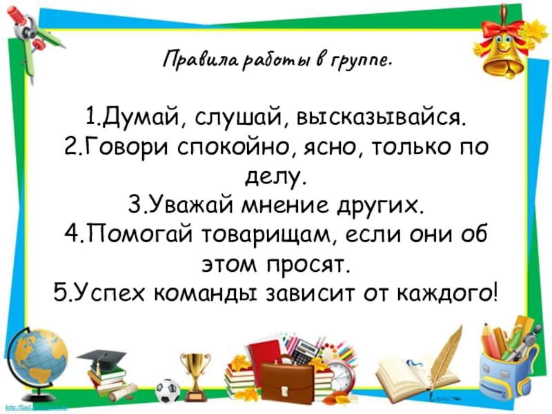 Правила работы в группе.  1.Думай, слушай, высказывайся. 2.Говори спокойно, ясно, только по делу. 3.Уважай мнение других.