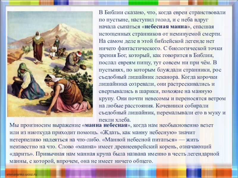 На самом деле в этой библейской легенде нет ничего фантастического. С биологической точки зрения Бог, который, как говорится в Библии, послал евреям пищу, тут совсем ни при чём. В пустынях, по которым блуждали странники, рос съедобный лишайник леканора. Когда корочки лишайника созревали, они растрескивались и свертывались в шарики, похожие на манную крупу. Они почти невесомы и переносятся ветром на любые расстояния. Кочевники собирали съедобный лишайник, перемалывали его в муку и пекли хлеба.