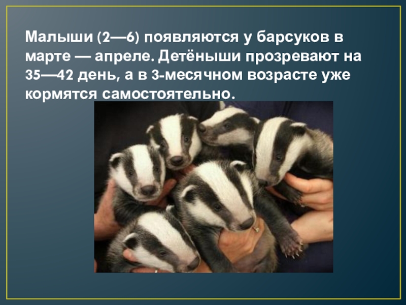 Слайд 5Малыши (2—6) появляются у барсуков в марте — апреле. Детёныши прозревают на