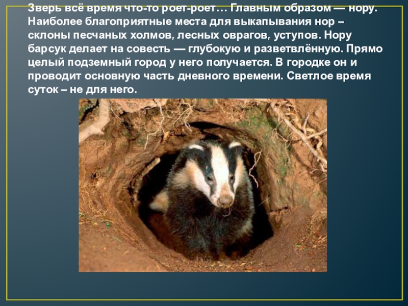 Слайд 8Зверь всё время что-то роет-роет… Главным образом — нору. Наиболее благоприятные