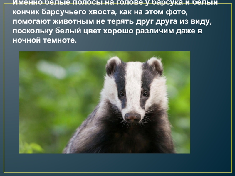 Слайд 11Именно белые полосы на голове у барсука и белый кончик барсучьего хвоста, как