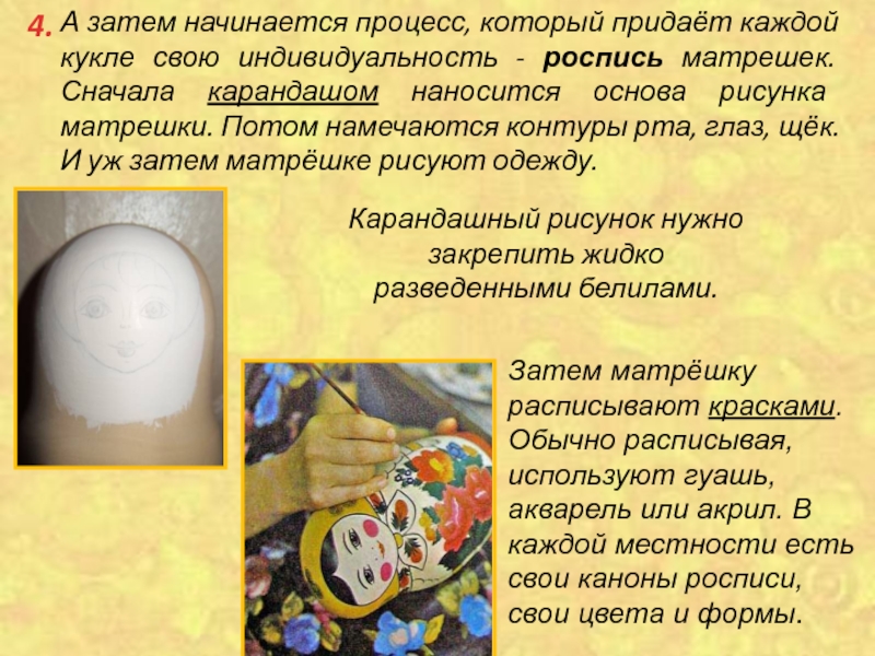 Затем матрёшку расписывают красками. Обычно расписывая, используют гуашь, акварель или акрил. В каждой местности есть свои каноны росписи, свои цвета и формы.