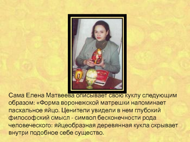 Сама Елена Матвеева описывает свою куклу следующим образом: «Форма воронежской матрешки напоминает пасхальное яйцо. Ценители увидели в нем глубокий философский смысл - символ бесконечности рода человеческого: яйцеобразная деревянная кукла скрывает внутри подобное себе существо.