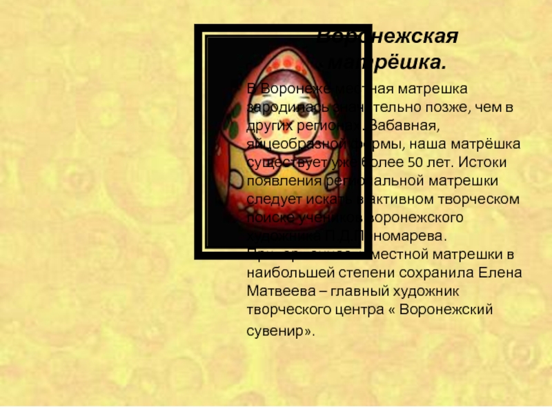 В Воронеже местная матрешка зародилась значительно позже, чем в других регионах. Забавная, яйцеобразной формы, наша матрёшка существует уже более 50 лет. Истоки появления региональной матрешки следует искать в активном творческом поиске учеников воронежского художника П.Д.Пономарева. Приверженность местной матрешки в наибольшей степени сохранила Елена Матвеева – главный художник творческого центра « Воронежский сувенир».