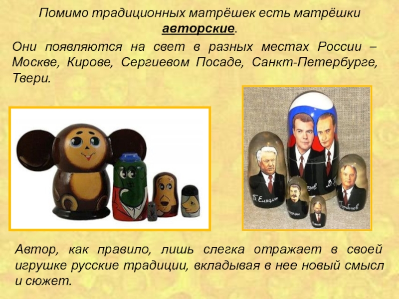 Автор, как правило, лишь слегка отражает в своей игрушке русские традиции, вкладывая в нее новый смысл и сюжет.