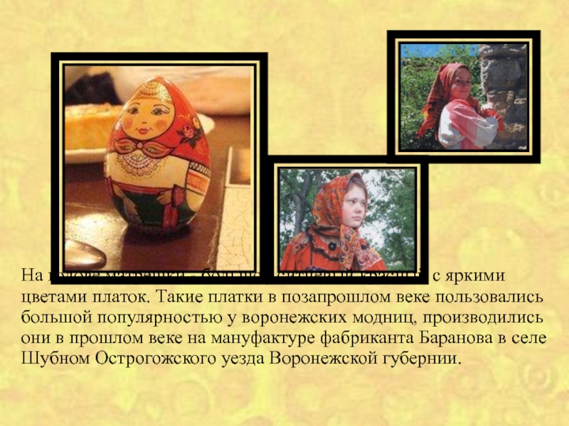 На голове матрешки - большой ситцевый красный с яркими цветами платок. Такие платки в позапрошлом веке пользовались большой популярностью у воронежских модниц, производились они в прошлом веке на мануфактуре фабриканта Баранова в селе Шубном Острогожского уезда Воронежской губернии.