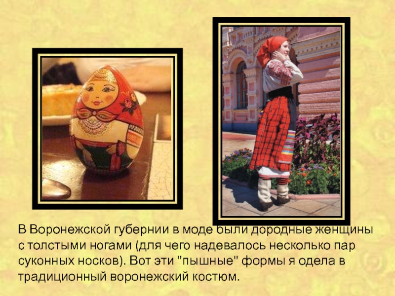 В Воронежской губернии в моде были дородные женщины с толстыми ногами (для чего надевалось несколько пар суконных носков). Вот эти "пышные" формы я одела в традиционный воронежский костюм.