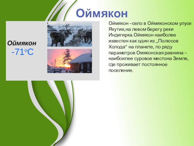 известен как один из ,,Полюсов Холода” на планете, по ряду параметров Омяконская равнина –наибоилее суровое местона Земле,где проживает постоянное поселение.