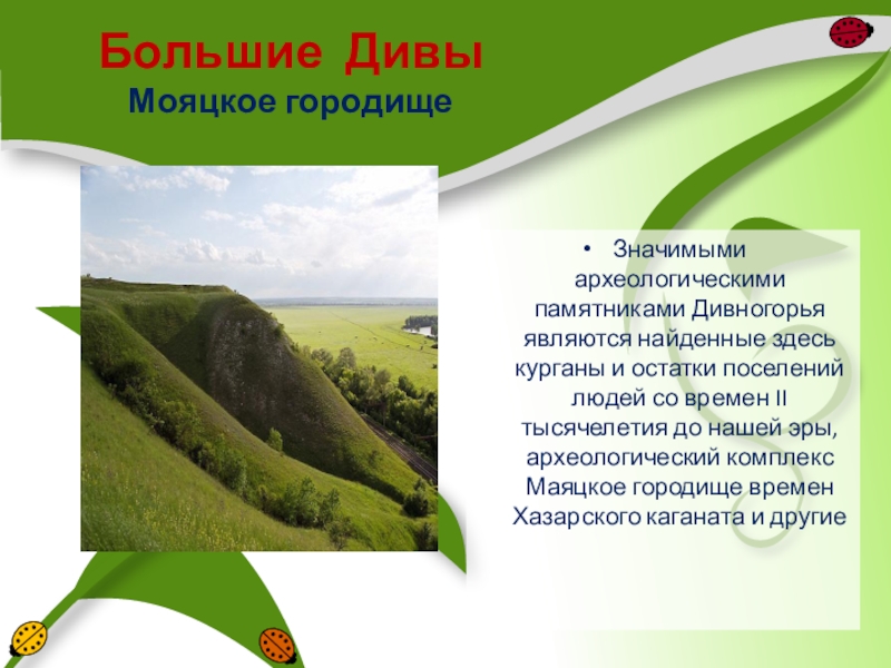 остатки поселений людей со времен II тысячелетия до нашей эры, археологический комплекс Маяцкое городище времен Хазарского каганата и другие