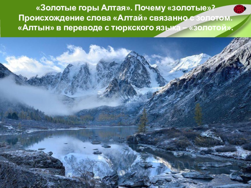 Слайд 31«Золотые горы Алтая». Почему «золотые»? Происхождение слова «Алтай» связанно с золотом.