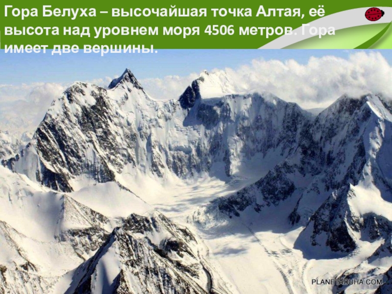 Слайд 36Гора Белуха – высочайшая точка Алтая, её высота над уровнем моря