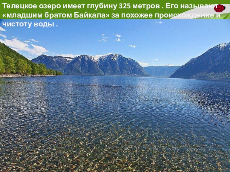 Слайд 34Телецкое озеро имеет глубину 325 метров . Его называют «младшим братом