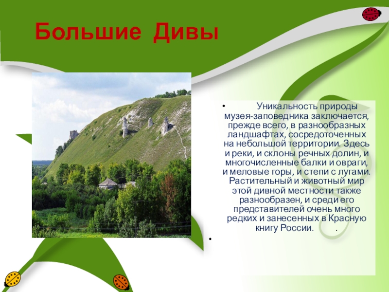 сосредоточенных на небольшой территории. Здесь и реки, и склоны речных долин, и многочисленные балки и овраги, и меловые горы, и степи с лугами. Растительный и животный мир этой дивной местности также разнообразен, и среди его представителей очень много редких и занесенных в Красную книгу России. .