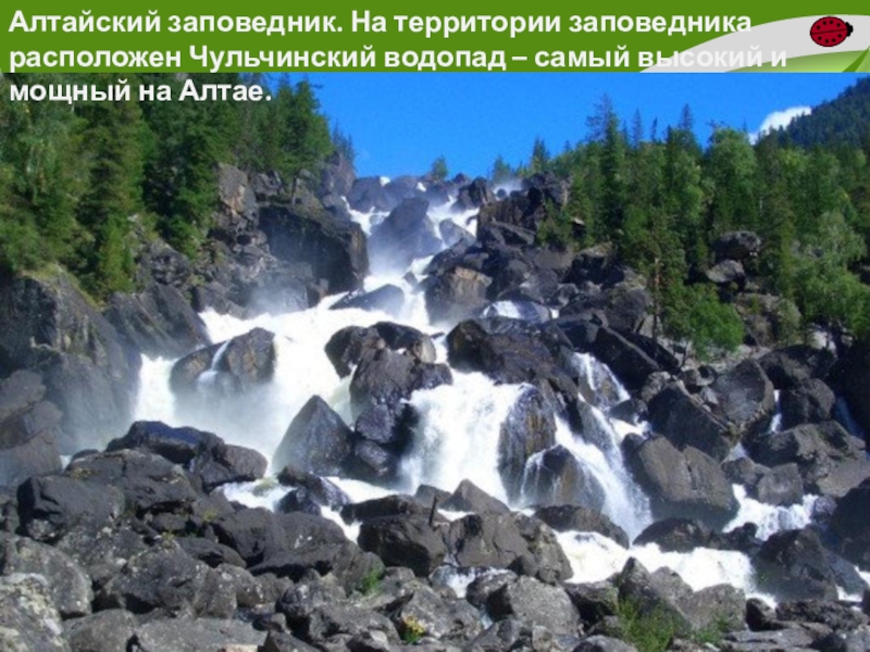 Слайд 33Алтайский заповедник. На территории заповедника расположен Чульчинский водопад – самый высокий