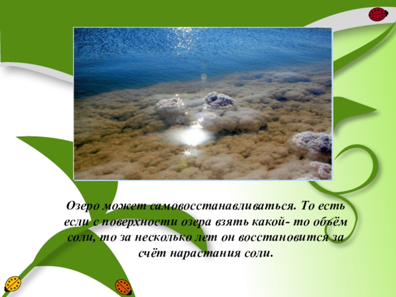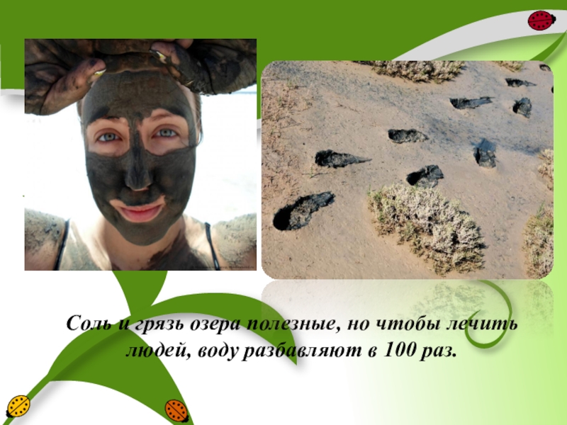 Слайд 20Соль и грязь озера полезные, но чтобы лечить людей, воду разбавляют