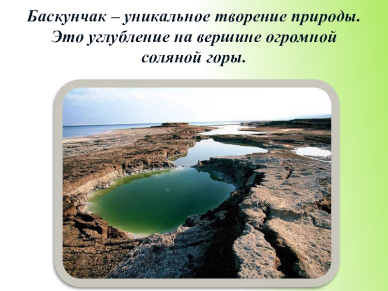 Слайд 18Баскунчак – уникальное творение природы. Это углубление на вершине огромной соляной