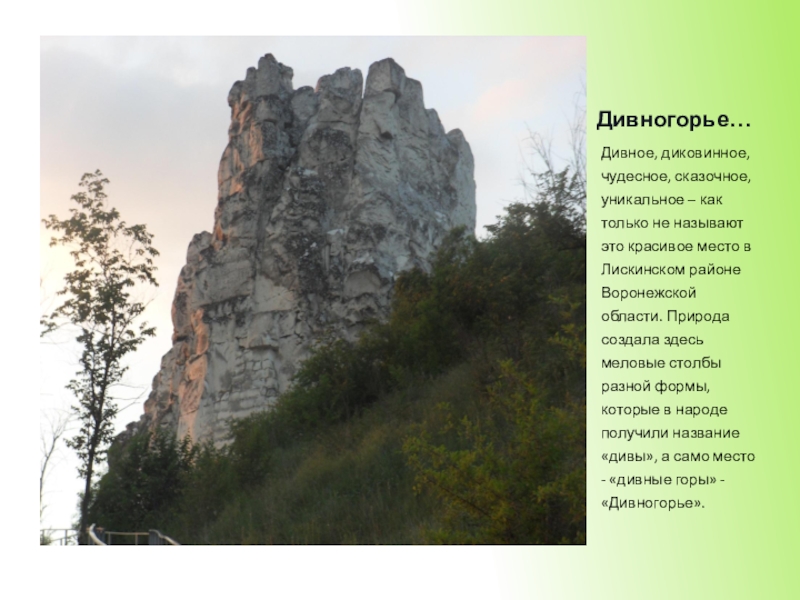 красивое место в Лискинском районе Воронежской области. Природа создала здесь меловые столбы разной формы, которые в народе получили название «дивы», а само место - «дивные горы» - «Дивногорье».