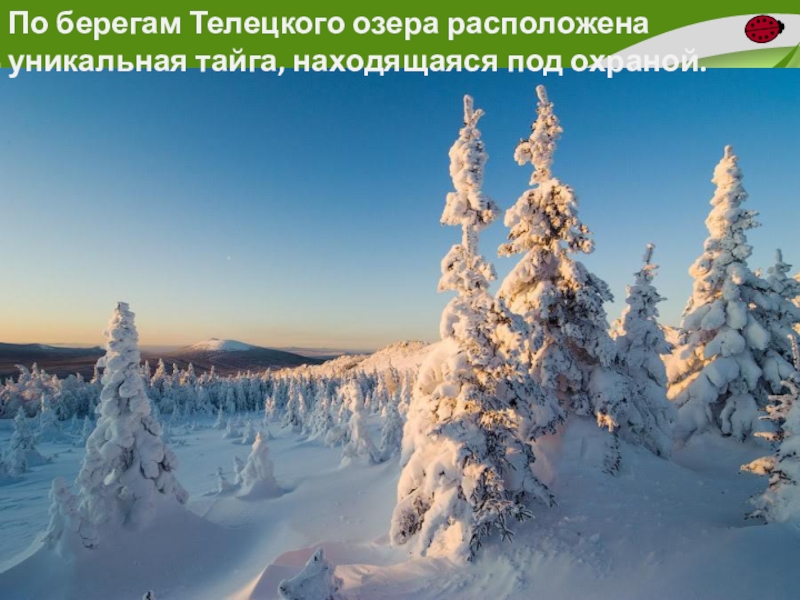 Слайд 35По берегам Телецкого озера расположена уникальная тайга, находящаяся под охраной.