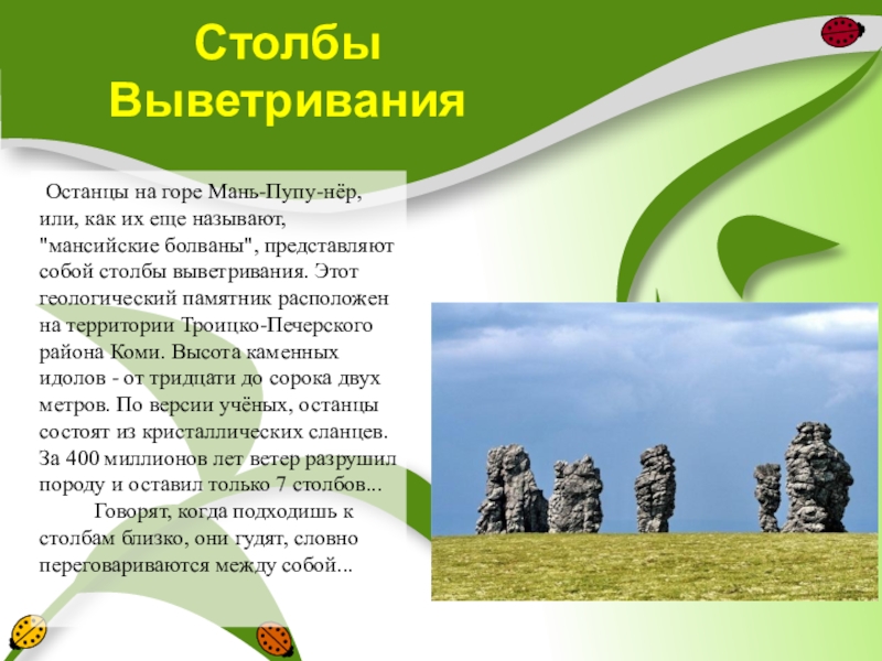 "мансийские болваны", представляют собой столбы выветривания. Этот геологический памятник расположен на территории Троицко-Печерского района Коми. Высота каменных идолов - от тридцати до сорока двух метров. По версии учёных, останцы состоят из кристаллических сланцев. За 400 миллионов лет ветер разрушил породу и оставил только 7 столбов...