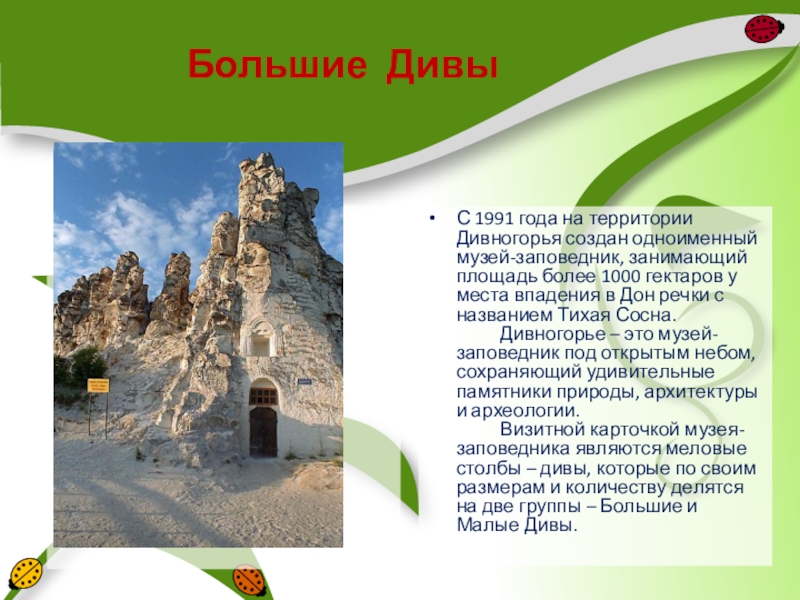 Визитной карточкой музея-заповедника являются меловые столбы – дивы, которые по своим размерам и количеству делятся на две группы – Большие и Малые Дивы.