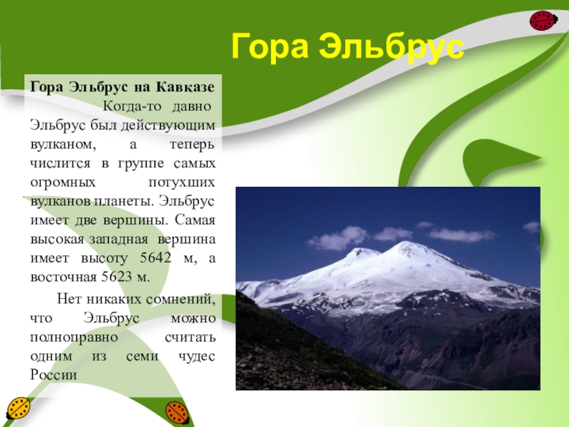 Когда-то давно Эльбрус был действующим вулканом, а теперь числится в группе самых огромных потухших вулканов планеты. Эльбрус имеет две вершины. Самая высокая западная вершина имеет высоту 5642 м, а восточная 5623 м.