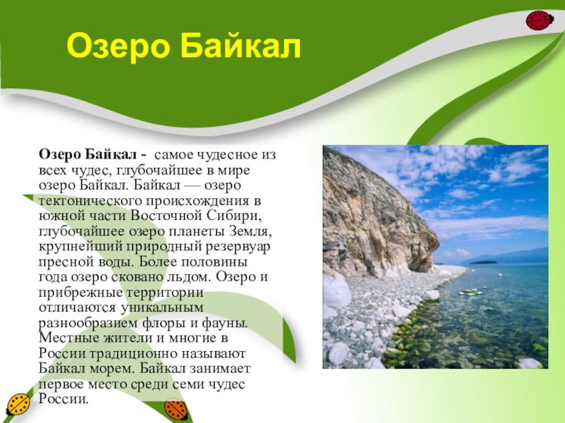 мире озеро Байкал. Байкал — озеро тектонического происхождения в южной части Восточной Сибири, глубочайшее озеро планеты Земля, крупнейший природный резервуар пресной воды. Более половины года озеро сковано льдом. Озеро и прибрежные территории отличаются уникальным разнообразием флоры и фауны. Местные жители и многие в России традиционно называют Байкал морем. Байкал занимает первое место среди семи чудес России.