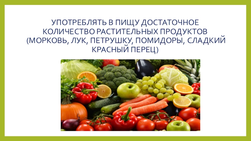 Слайд 14УПОТРЕБЛЯТЬ В ПИЩУ ДОСТАТОЧНОЕ КОЛИЧЕСТВО РАСТИТЕЛЬНЫХ ПРОДУКТОВ (МОРКОВЬ, ЛУК, ПЕТРУШКУ, ПОМИДОРЫ,