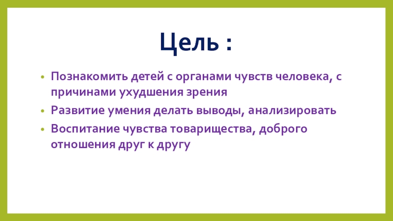 Цель :Познакомить детей с органами чувств человека, с причинами ухудшения зренияРазвитие умения делать выводы, анализироватьВоспитание чувства товарищества, доброго отношения друг к другу