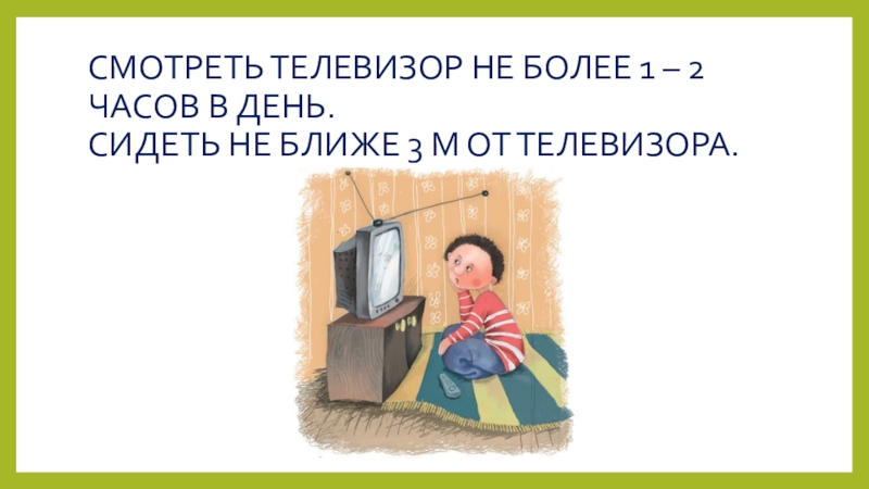 СМОТРЕТЬ ТЕЛЕВИЗОР НЕ БОЛЕЕ 1 – 2 ЧАСОВ В ДЕНЬ. СИДЕТЬ НЕ БЛИЖЕ 3 М ОТ ТЕЛЕВИЗОРА.