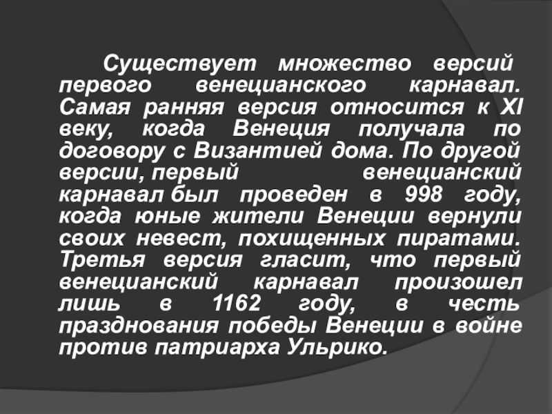 Слайд 10 Существует множество версий первого венецианского карнавал. Самая ранняя версия