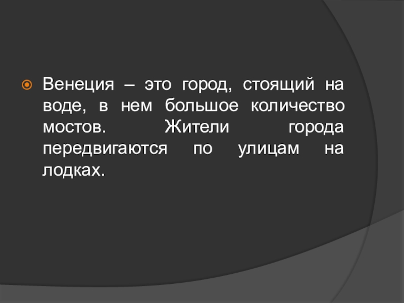 Венеция – это город, стоящий на воде, в нем большое количество мостов. Жители города передвигаются по улицам