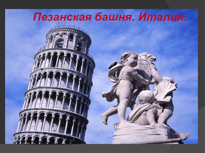 Италия очень красивая страна, в которой много ценностей европейской культуры. Большое количество городов (Рим, Венеция, Флоренция, Пиза, Милан) – просто настоящие музеи под открытым небом. Рим – столица Италии.