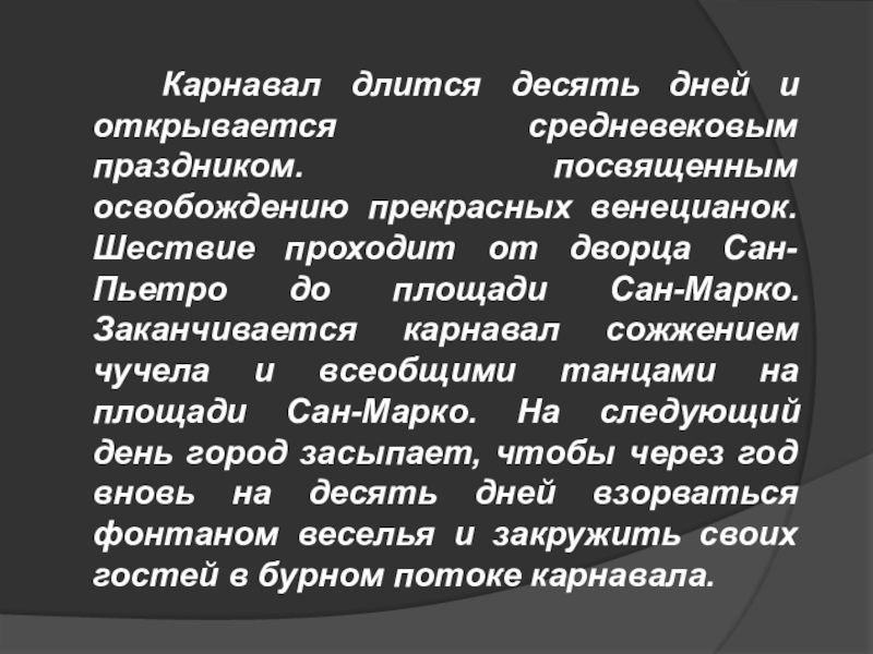 освобождению прекрасных венецианок. Шествие проходит от дворца Сан-Пьетро до площади Сан-Марко. Заканчивается карнавал сожжением чучела и всеобщими танцами на площади Сан-Марко. На следующий день город засыпает, чтобы через год вновь на десять дней взорваться фонтаном веселья и закружить своих гостей в бурном потоке карнавала.