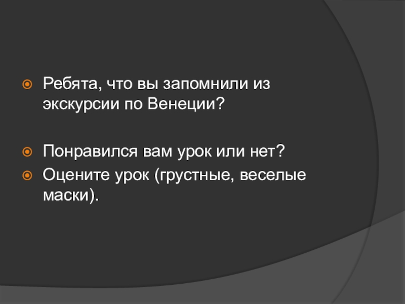 Ребята, что вы запомнили из экскурсии по Венеции? Понравился вам урок или нет?Оцените урок (грустные, веселые маски).