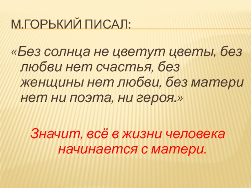М.Горький писал:«Без солнца не цветут цветы, без любви нет счастья, без женщины нет любви, без матери нет