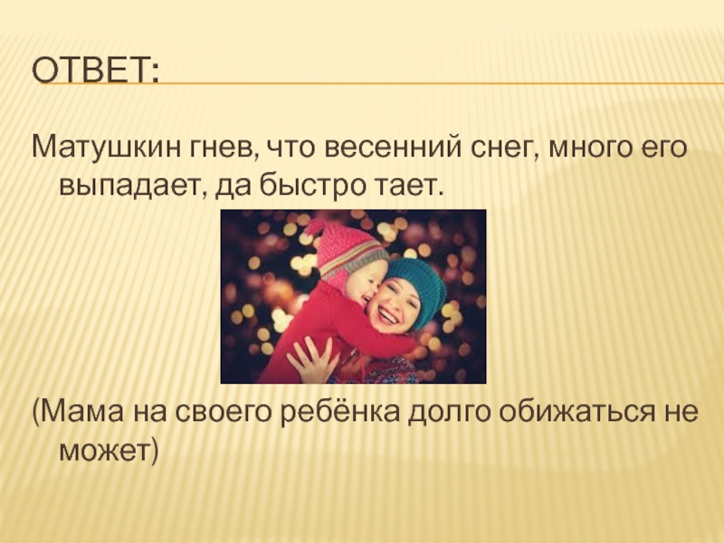 Ответ:Матушкин гнев, что весенний снег, много его выпадает, да быстро тает.(Мама на своего ребёнка долго обижаться не