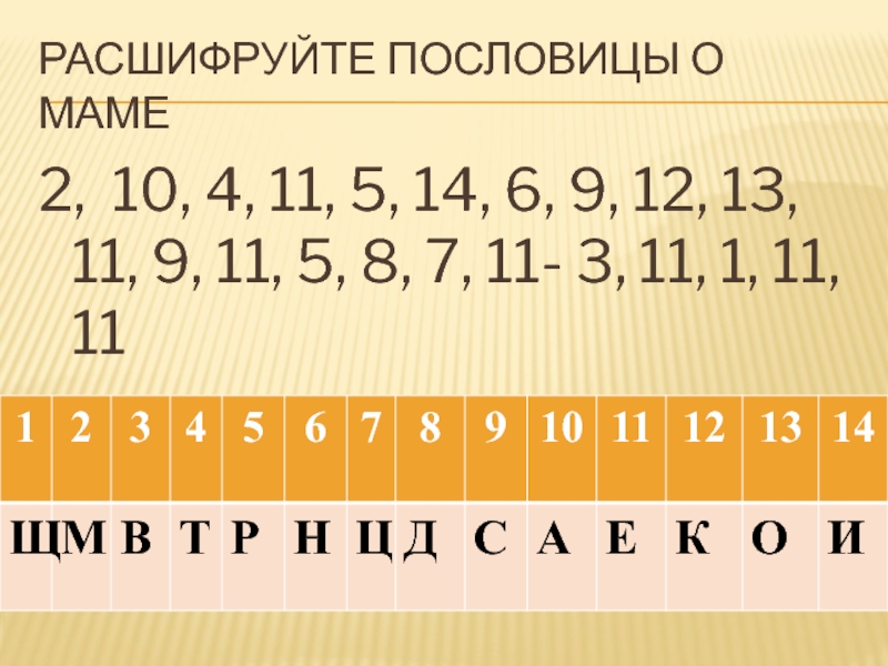 Расшифруйте пословицы о маме2, 10, 4, 11, 5, 14, 6, 9, 12, 13, 11, 9, 11, 5,
