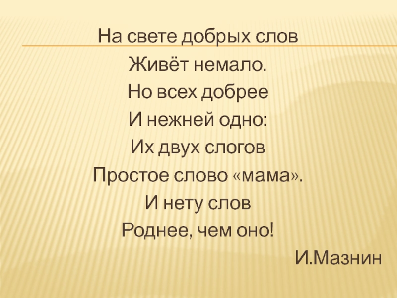 На свете добрых словЖивёт немало.Но всех добрееИ нежней одно:Их двух слоговПростое слово «мама».И нету словРоднее, чем оно!И.Мазнин