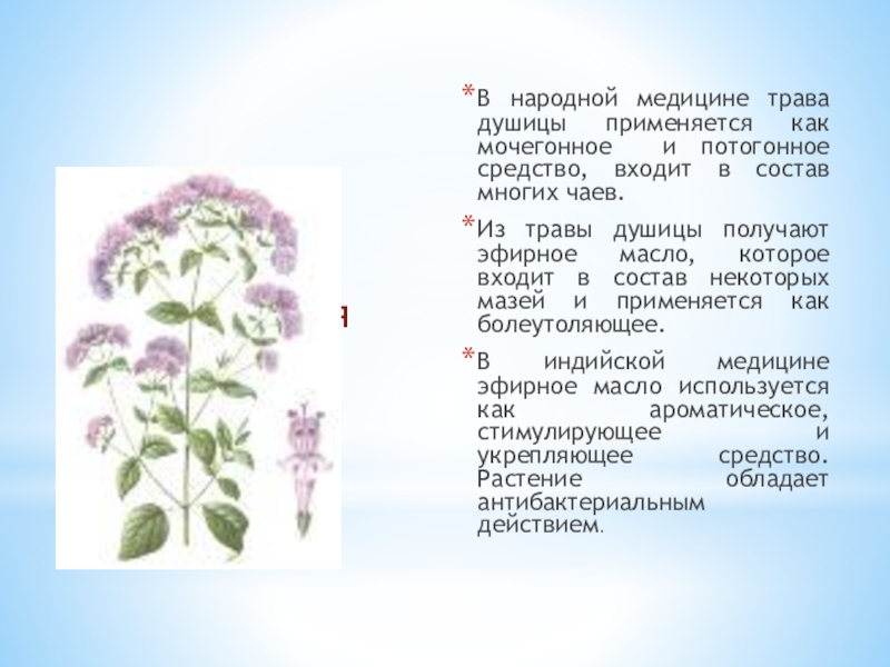 В народной медицине трава душицы применяется как мочегонное и потогонное
