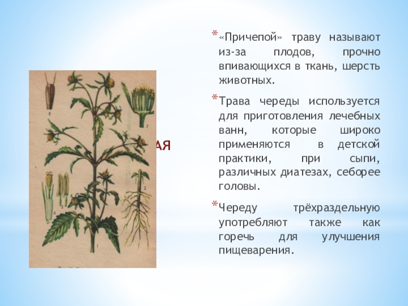 Трава череды используется для приготовления лечебных ванн, которые широко применяются в детской практики, при сыпи, различных диатезах, себорее головы.