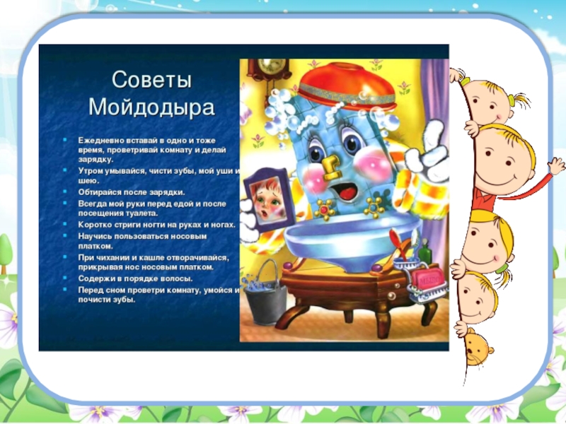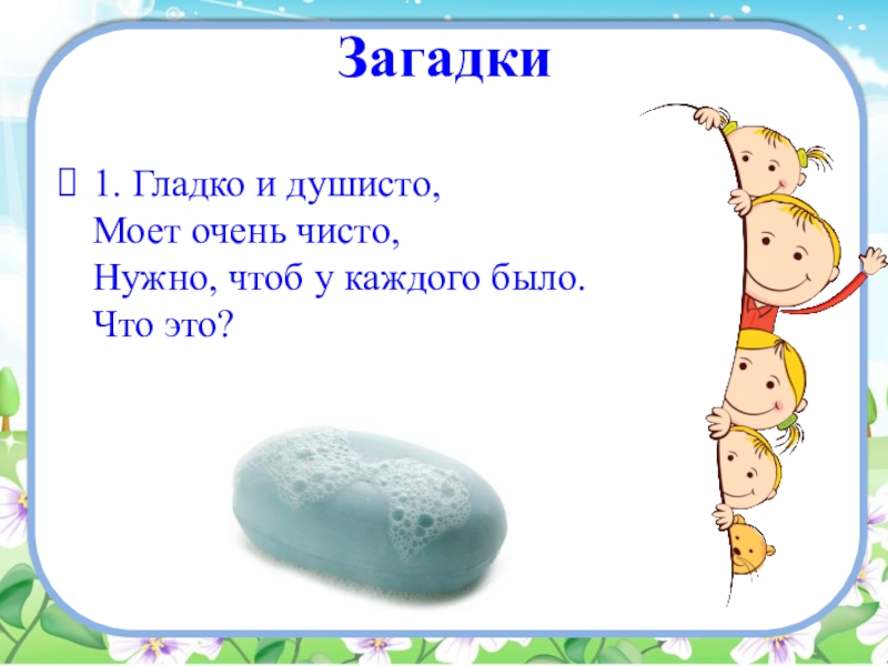 Загадки1. Гладко и душисто, Моет очень чисто,  Нужно, чтоб у каждого было.  Что это?